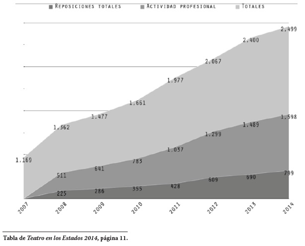 Para la edición de 2014, contando ya con el material de ocho años, se podían observar algunas imprecisiones en la metodología:9 la tendencia general al alza de la actividad teatral en los estados,10 en contraste con la corta vida de las obras. Por lo tanto, establecimos un nuevo indicador llamado Actividad profesional, el cual se compone con la suma de las reposiciones de un año más las del año siguiente. Esa suma da un estimado de la producción teatral profesional, una proyección no exacta pero razonable y acorde con las características de la actividad. De hecho, es una cifra mucho más precisa que un promedio anual, por ejemplo.