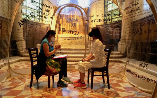 Los últimos talleres, centrados en la fotografía, la escritura, el dibujo y la narración, permiten a los participantes profundizar y comunicar sus recuerdos del pasado, el dolor del presente, y sus imaginaciones para el futuro. ¿Cómo pueden reescribir las narrativas traumáticas para que también aquí (como en Antígona) puedan reclamar su agencia, cambiar el final y crear historias que les permitan vivir? El 23 de abril de 2022, el ZCMP inauguró Imagine Repair, un performance-exposición en la Catedral de San Juan el Divino de Harlem. Los participantes trabajaron con los responsables de los talleres e invitaron a otros artistas a crear un performance en la nave de la catedral y una exposición en las capillas adyacentes. Los habitantes de la comunidad construyeron altares para sus muertos. Los participantes expusieron las tarjetas de espíritus, dibujos, fotos, videos y dibujos que habían creado. En “Habla con el futuro”, la artista chilena María José Contreras, sentada en una cápsula de plástico, les preguntó a los visitantes qué mensajes y recuerdos dejarían para las generaciones futuras en la cápsula del tiempo [Ver Imagen 2].