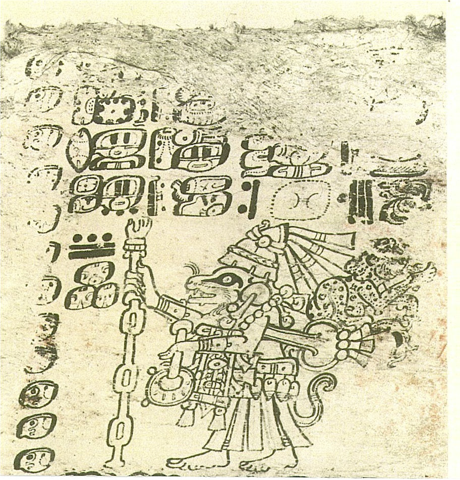 Imagen 1. Fragmento del Códice Dresde, lámina 26, en el que se aprecia un Bacab, sacerdote disfrazado como tlacuache o zarigüeya (ooch o uch) de nombre chac rojo. El original se encuentra en el Departamento de Manuscritos, Sächsische Landesbibliothek, en Dresde, Alemania, y su versión digitalizada se puede consultar en la página oficial de la Fundación para el Avance de los Estudios Mesoamericanos, Inc. (FAMSI, por sus siglas en inglés): http://www.famsi.org/spanish/mayawriting/codices/dresden.html
